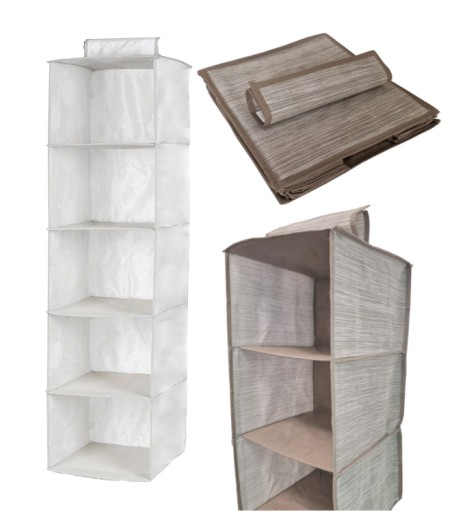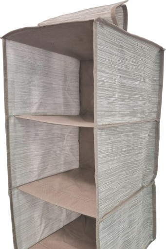 Szary organizer składający się z 5 wiszących półek służących do przechowywania odzieży, czapek szalików bluzek. Pozwoli ci posegregować rzeczy i zapanować nad bałaganem . Znajdzie swoje zastosowanie w szafie ,garderobie czy nawet pokoju dziecka.