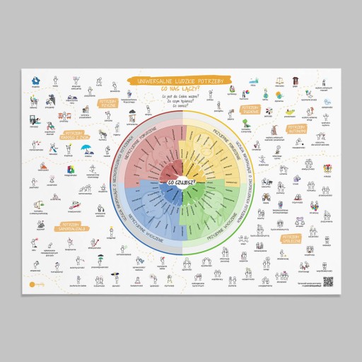 Plakat z kompasem uczuć i uniwersalnymi potrzebami to doskonałe narzędzie i wystrój pomieszczenia w jednym. Powieś go w widocznym miejscu i codziennie zauważaj swoje uczucia i nasze wspólne potrzeby.