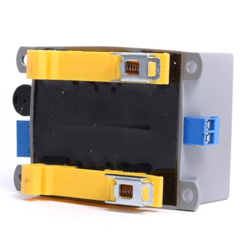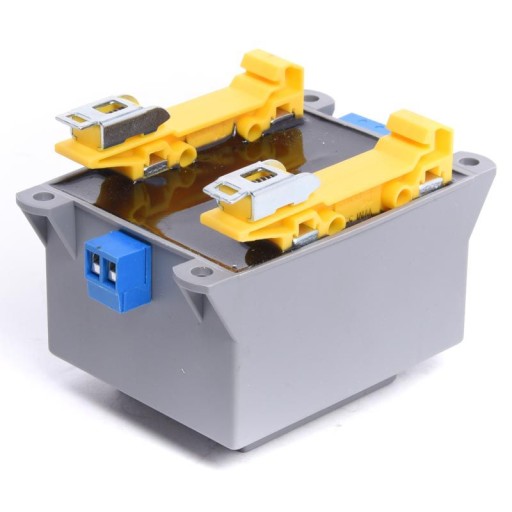 Zalewany transformator sieciowy , zbudowany z użyciem rdzenia kształtkowego EI w obudowie z mocowaniem na szynę DIN (TS35).