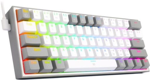 Klawiatura REDRAGON K617 Fizz RGB to sprzęt przygotowany przez renomowanego producenta tak, aby odpowiadał potrzebom graczy. Wykonana z tworzywa sztucznego klawiatura wyposażona jest w 61 klawiszy, w tym te funkcyjne. Jest niezbyt duża - nie ma dodatkowej klawiatury numerycznej, idealnie sprawdzi się zatem na biurkach o małej powierzchni. Klawisze są oznaczone różnymi kolorami, aby szybciej zorientować się, co należy nacisnąć w danej sytuacji. Dla zwiększenia komfortu nocnych rozgrywek producent implementował oświetlenie klawiatury.