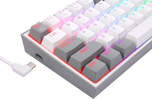 Klawiatura REDRAGON K617 Fizz RGB łączy się z komputerem przy pomocy kabla typu USB. Jest to bardziej efektywne połączenie niż bezprzewodowe alternatywy. Daje to przewagę w czasie rozgrywki.