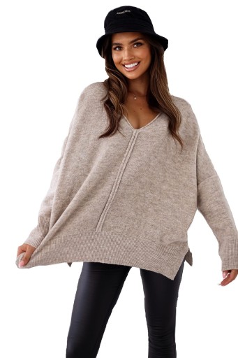 Luźny sweter V neck z przeszyciem świetnie sprawdzi się do wielu różnych stylizacji, nadając im charakteru i pazura.