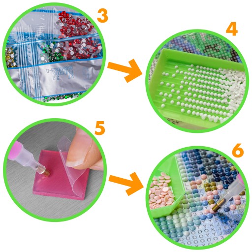 - Znajdź na odklejonej części płótna odpowiednie symbole i numery. Wsyp do plastikowego pojemnika porcję wybranego koloru kryształków.