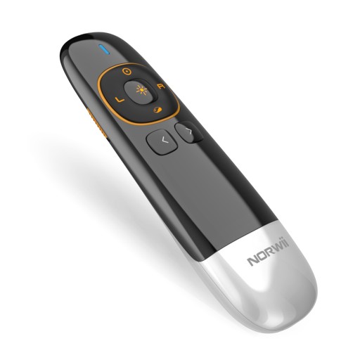 Pilot do prezentacji multimedialnych Norwii N86s pozwala poruszać kursorem na ekranie w sposób równie łatwy i precyzyjny, jak za pomocą myszki. Urządzenie działa jak magiczna różdżka – po aktywowaniu czujnika ruchu po prostu przesuwasz nim w powietrzu, a strzałka zmienia swoje położenie. Przyciski "L" oraz "R" odpowiadają lewemu i prawemu klawiszowi myszki. Norwii N86s umożliwia więc nie tylko płynną nawigację między slajdami, ale także swobodne kontrolowanie przestrzeni roboczej Twojego komputera. Pilot wspiera również funkcje gumkowania lub rysowania na ekranie. Tradycyjna myszka nie będzie Ci już potrzebna podczas wystąpień!