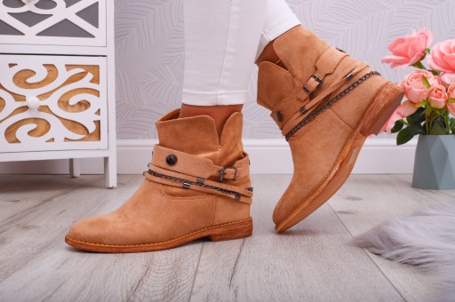 Damskie, wsuwane botki na obcasie w kolorze beżowym z ozdobnymi łańcuszkami i paseczkami. Posiadają ukryty koturn oraz delikatne ocieplenie. Stabilna, gruba podeszwa dobrze amortyzuje stopę oraz chroni przed zimnem.❄ Wykonane z dobrych jakościowo materiałów. Prosty fason sprawia, że pasują do wielu stylizacji.