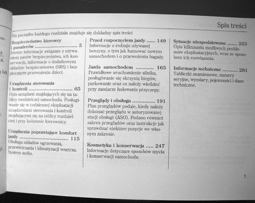- Przed rozpoczęciem jazdy (informacje o rodzaju używanej benzyny, o tym jak hamować nowym samochodem i o przewożeniu bagaży).