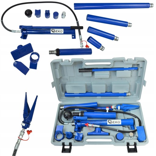 Zestaw profesjonalnych rozpieraków 10 ton w walizce. Zestaw został wyposażony w wydajną pompę hydrauliczną dzięki której wykonasz następujące prace: podnoszenie, ściąganie, zginanie, prostowanie oraz rozpieranie.