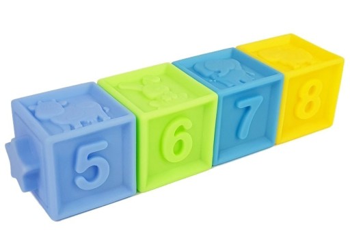 Różnokolorowe kostki posiadają wgłębienia i wypustki, dzięki czemu dziecko odkryje ogrom nowych wrażeń. Może dopasowywać do siebie klocki, budować budowle. Stworzone są z miękkiego tworzywa, dzięki czemu jest bezpieczne dla maluszków. Na kostkach widnieją też różnorodne kształty zwierząt, cyfr, oraz różnych wzorów np. choinka, serduszko czy gwiazdki. Usprawni umiejętność chwytania, a kolory i ich faktury ułatwią zabawę w zapamiętywanie i odgadywanie, równocześnie rozwijając wyobraźnię. Po mocniejszym naciśnięciu słychać dźwięk piszczenia. Zaletą tej zabawki jest to, że stworzona jest z gumowego tworzywa, które dobrze nadają się podczas ząbkowania.