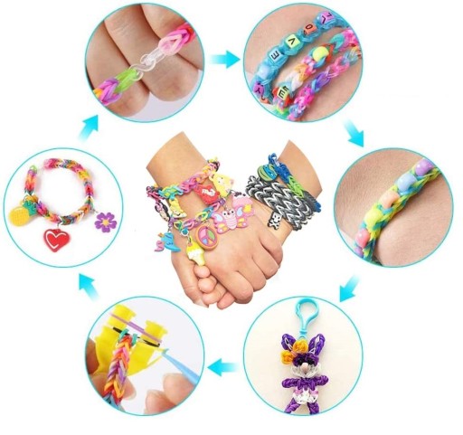 Kreatywny zestaw umożliwiający stworzenie swojej własnej bransoletki, gumki do włosów, kokardki lub wielu innych przedmiotów. Bransoletki można ozdobić kolorowymi zawieszkami (12 w zestawie). Doskonale sprawdzą się również jako opaska. Zestaw to idealny prezent dla każdej pociechy oraz wspaniale spędzony czas.