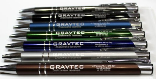 Na długopisach możemy wygrawerować dowolny tekst, grafikę, logo.