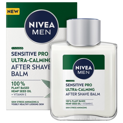NIVEA® MEN SENSITIVE PRO Ultra-Calming balsam po goleniu z 100% organicznym olejem z nasion konopnych i witaminą E. Przynosi natychmiastowe nawilżenie i wygładzenie zestresowanej skórze.