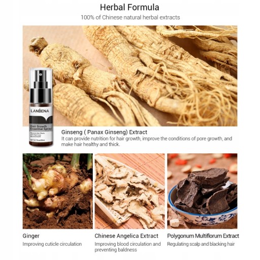 Effects:LANBENA GROWTH ESSENCE SPRAY has the functions of accelerating blood circulation on scalp , enhancing the massiness of hair follicles and roots , swel-ing hair roots , promoting melanin synthesis , mending hair quality , LANBENA GROWTH ESSENCE SPRAY ( Strong Version ) could also help you with the following ways , such as increasing hair elasticity , speeding up the hair growth and cleaning deposit dirty on sebum of pore thoroughly , . LANBENA GROWTH ESSENCE SPRAY is effective to all kinds of hair-loss alopecia areata and alopecia totalis . It is the most effectual herbal hair growth product