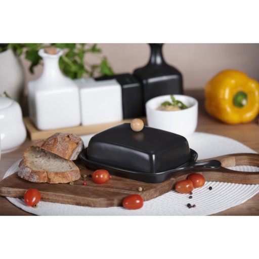 Maselniczka Ronnie marki Galicja wykonana została z wysokiej jakości ceramiki, która pięknie prezentuje się na blacie kuchennym czy stole. Atutem ceramiki jest to, że nie pochłania zapachów, dzięki czemu przechowywane, przygotowywane i serwowane w niej produkty nie tracą swojego aromatu oraz smaku. Jej podstawa ma delikatne wyżłobienia na kostkę masła. Jest w prostokątnym kształcie, który przedłużono o wystający, poręczny uchwyt. Całość dopełnia wysoka przykrywka z uroczym akcentem bambusa, w postaci okrągłego uchwytu. Ułatwia on podnoszenie pokrywki i jednocześnie jest elementem dekoracyjnym.