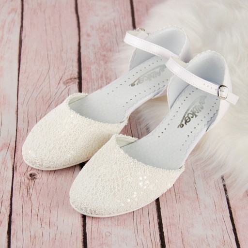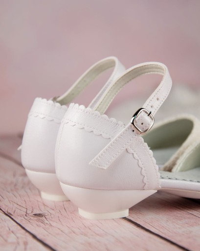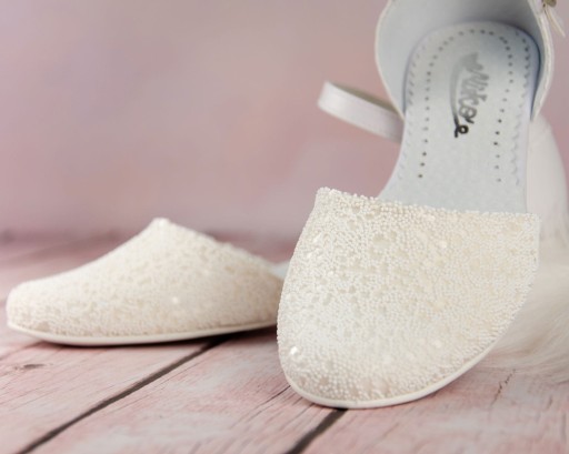 Eleganckie, białe buty komunijne dla dziewczynki, zapinane na regulowany paseczek ze sprzączką. Buciki dobrze wyprofilowane, dzięki czemu pewnie trzymają się stopy. Model na delikatnym obcasiku o wysokości 2,5 cm, w kolorze białym. Uroku dodaje im ozdobny przód cholewki zdobiony pięknymi, drobnymi koralikami. Zewnętrzna część obuwia wykonana jest ze skóry ekologicznej, natomiast zapiętek i wkładka ze skóry naturalnej. Buty idealnie będą pasować do większości sukieneczek z naszej kolekcji.