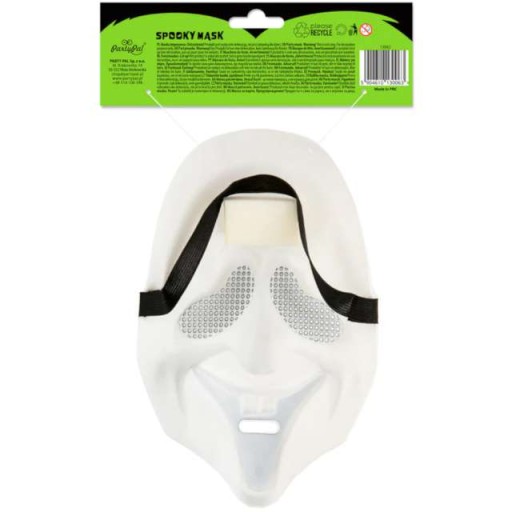 Klasyczna biała maska ducha łudząco przypominająca mrocznego kosiarza z kultowych horrorów ze starszych lat. Wycięte oczy oraz szeroki uśmiech skojarzy się Twoim znajomym upiornie i doda do Twojego stroju nutkę upiorności.