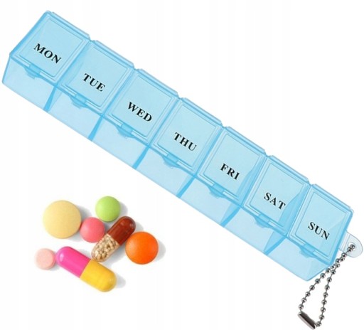 To idealne rozwiązanie dla osób, które chcą mieć kontrolę nad swoim codziennym zażywaniem leków. Każda z siedmiu przegród jest opisana dniem tygodnia w skrócie po angielsku, dzięki czemu bez trudu można odczytać, jaki lek należy przyjąć danego dnia. Pojemnik posiada również łańcuszek, który umożliwia zawieszenie go na haczyku lub przyczepienie do kluczyków.