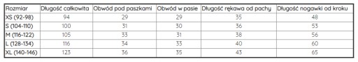 - Kostium w postaci jednoczęściowego kombinezonu (długie spodnie, długi rękaw),
