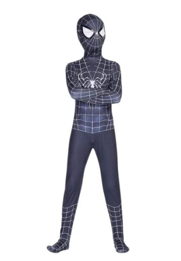 Jednoczęściowy kostium Człowieka Pająka w kolorze ciemno grafitowym. Dobrze wykonany, lekko elastyczny, zapinany na zamek błyskawiczny, przez co zakładanie kostiumu jest szybkie i wygodne.