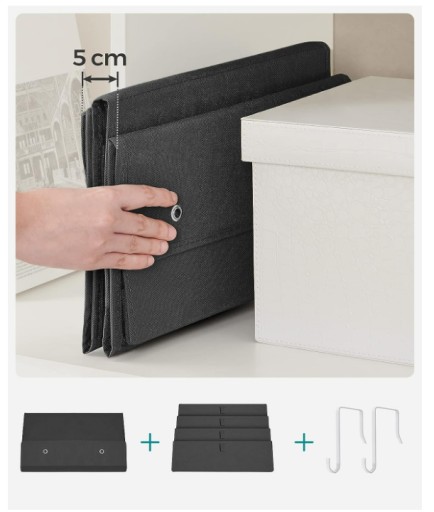 - Materiał: włóknina 80 g/m², konstrukcja wewnętrzna z tektury o grubości 2 mm, panele tylne z tektury o grubości 3 mm, metalowe haczyki