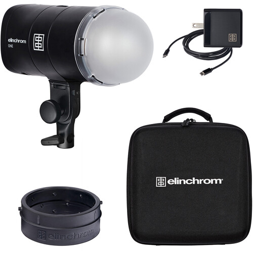 Zestaw obejmujący 1 lampę Elinchrom ONE, 1 adapter Elinchrom OCF, 1 kopułkę dyfuzyjną Elinchrom OCF, 1 ładowarkę sieciową Elinchrom 65 W USB-C, 1 kabel Elinchrom USB-C 1,8 m i plecak Elinchrom ONE.