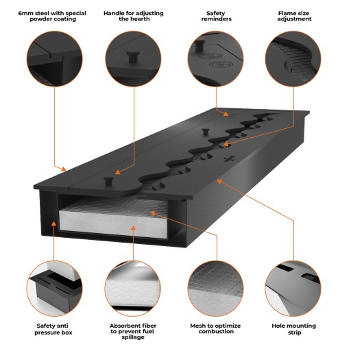Pod palnikiem znajduje się tzw. podkładka wykonana również ze stali o grubości 6mm, ma za zadanie absorbować ciepło emitowane z palnika, nie pozwalając nagrzać się ponad normę podłożu. Dodatkowo palnik został umieszczony w obudowie, której zadaniem jest niwelować podciśnienie wynikające z przelania palnika biopaliwem.