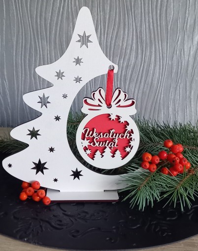 DWUSTRONNY DREWNIANY STOJAK CHOINKA Z BOMBKĄ Z TWOIM IMIENIEM I NAPISEM WESOŁYCH ŚWIĄT