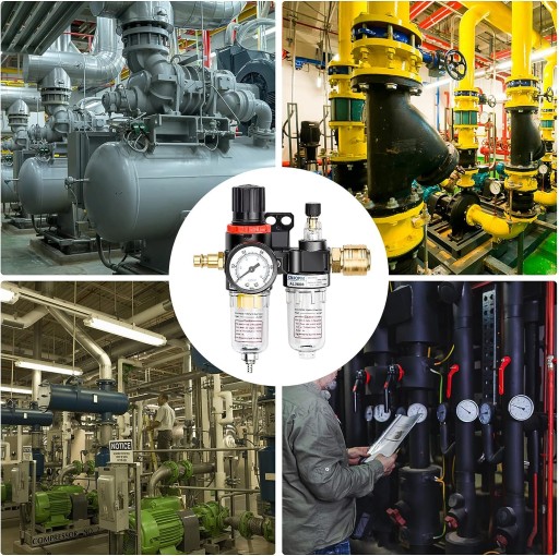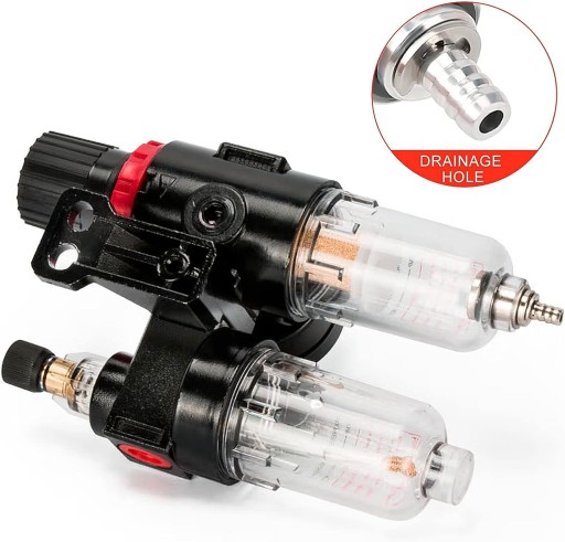 Filtr powietrza ma przezroczystą filiżankę filtra + element filtrujący + regulator ciśnienia. Regulator sprężonego powietrza to wydajna jednostka konserwacyjna z filtrem i separatorem wody, przyłącze z gwintem wewnętrznym 1/4 cala, do podłączenia sprężarki lub przewodu sprężonego powietrza.