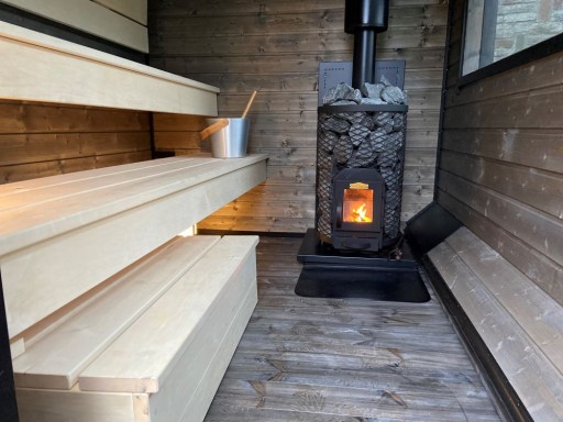 - Pierwsze rozpalenie pieca do sauny wykonaj na zewnątrz i bez kamieni, aby farba zewnętrzna osiągnęła twardość i uniknąć nieprzyjemnego zapachu. Unikaj zarysowania metalowych części. W razie potrzeby podłącz rurę dymną.