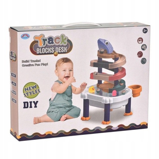 Stolik z wodną zjeżdżalnią to idealna zabawka dla dzieci uwielbiających zabawy z wykorzystaniem wody. Zestaw składa się z aż 15 elementów, które są duże i łatwe w montażu. Po złożonej zjeżdżalni można toczyć piłeczki, a po dodaniu wody spływać będą też gumowe zwierzątka. W zestawie jest także sitko, którym można wyławiać kuleczki i zabawki z wody i wkładać do koszyczków po bokach misy. Zestaw jest stoliczkiem, ale po odłączeniu nóżek misa z zjeżdżalnią swobodnie unosi się na wodzie i jest świetną zabawką do wanny. Zabawka jest lekka i łatwo ją zabrać w różne miejsca na przykład do ogrodu, piaskownicy czy na balkon.