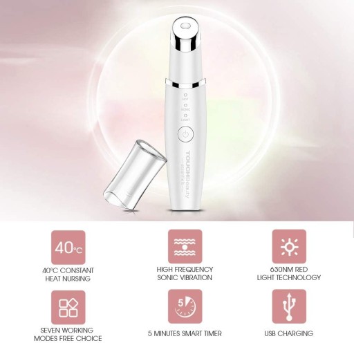 TOUCHBeauty Urządzenie do masażu oczu 40℃, ogrzewane, elektryczne urządzenie przeciwzmarszczkowe, wibracje Sonic z czerwonym światłem LED, urządzenie do terapii cieni pod oczami, możliwość ponownego