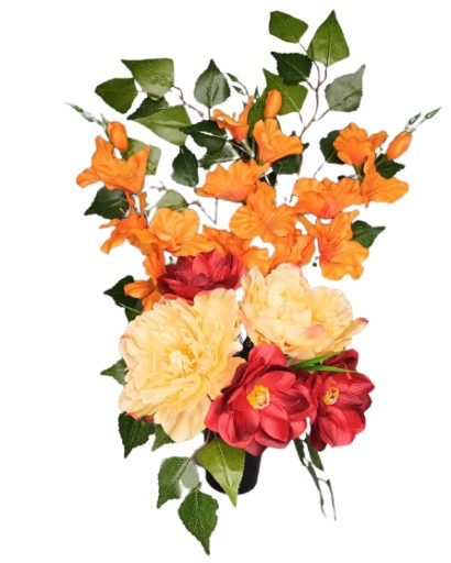 Wiązanka nagrobna wykonana ręcznie z wysokiej jakości sztucznych kwiatów w donicy zalanej betonem.