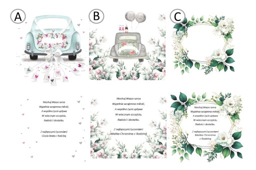 Pudełko zawiera imiona Państwa Młodych jak i również osób wręczających prezent. Do wyboru maja Państwo również dużą ilość życzeń ślubnych. Można przesłać własne.