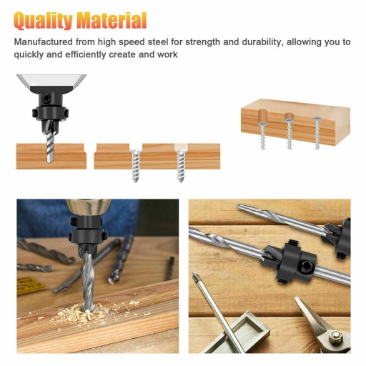 7-częściowy zestaw HSS zawiera 7 wierteł, 7 pogłębiaczy, 7 kołnierzy oporowych i 1 klucz imbusowy do wiercenia otworów