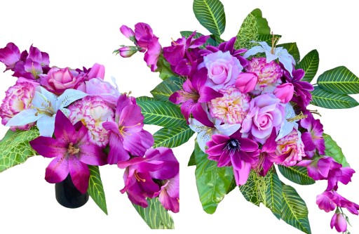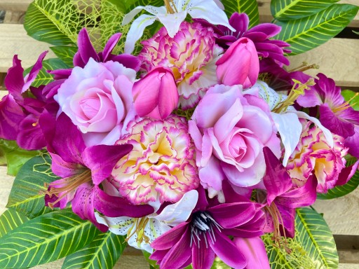 W skład bukietu i wiązanki wchodzi duży zestaw pięknych, sztucznych kwiatków w odcieniach ecru, różu i fuksji:
