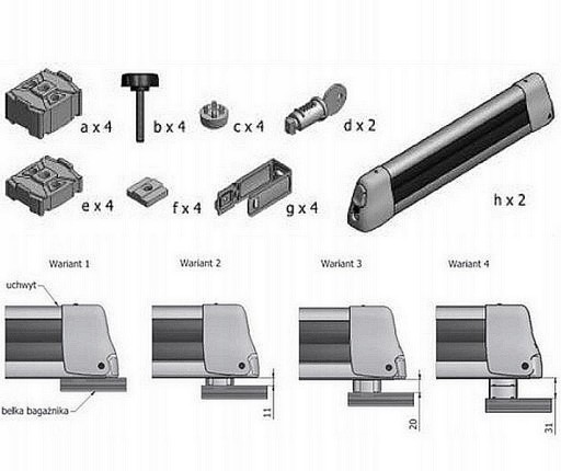 - Możliwość montażu na jednym z 4-ech poziomów ponad belką bazową (w zależności od wysokości wiązań przewożonych nart): Tak