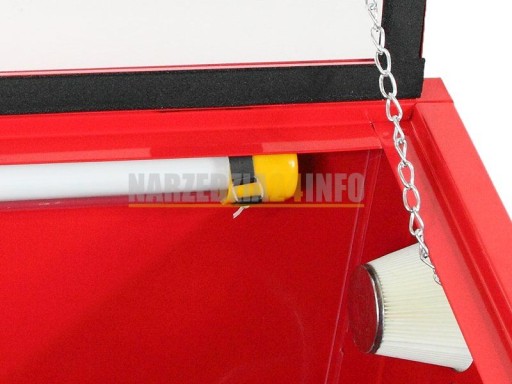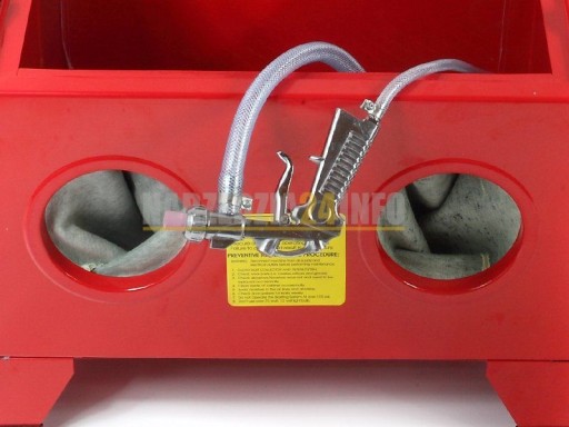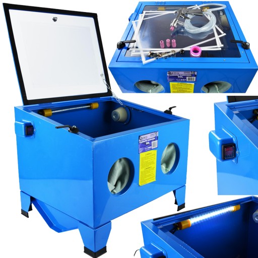 Piaskarka kabinowa o pojemności 90 litrów przeznaczona do pracy w obiegu zamkniętym ścierniwa. Idealne urządzenie do piaskowania małych przedmiotów. Maszyna posiada solidną komorę z klapą podnoszoną do góry, pistolet do piaskowania, cztery dysze ceramiczne , wysokiej jakości rękawice robocze , oświetlenie przestrzeni roboczej oraz duże okno - wizjer . Kompaktowa budowa oraz duża i pojemna przestrzeń robocza . Niezwykła łatwość obsługi, niezawodność oraz bezpieczeństwo pracy. Bezpyłowa praca urządzenia zapewniona jest dzięki zastosowaniu uszczelek obwodowych. Otwór odpływowy pozwala na szybką wymianę materiału do piaskowania. Cechy produktu pistolet do piaskowania z 4 wymiennymi ceramicznymi dyszami duże okno z wymienną folią ochronną oświetlenie - lampa jarzeniowa 12V otwór odpływowy umożliwia szybką zmianę materiału do piaskowania rękawice z gumy zintegrowane z urządzeniem stabilna kratownica na polu obróbczym antypoślizgowe gumowe stopki na nogach urządzenia Dane techniczne Napięcie: 230 V Pojemność robocza kabiny: 90 litry Rozmiary dysz do piaskowania: 4, 5, 6, 7 mm Ciśnienie robocze: 5 - 7 bar Wymiary okna: 485 x 390 mm Szerokość wnętrza kabiny: 580 mm Głębokość wnętrza kabiny: 485 mm Wysokość wnętrza tyłu kabiny: 355 mm Wysokość wnętrza przodu kabiny: 305 mm Całkowita szerokość piaskarki: 630 mm Całkowita wysokość piaskarki: 500 mm Całkowita głębokość piaskarki: 495 mm Zawartość zestawu pistolet do piaskowania wąż zasysający ścierniwo wąż przyłącza powietrza wraz z króćcem 4 ceramiczne dysze - 4, 5, 6, 7 mm zasilacz do lampy 12V z podłączeniem do sieci 230V 4 sztuki zamiennych folii do zabezpieczenia okienka 2 duże, zintegrowane z kabiną rękawice robocze wykonane z lateksu taśma teflonowa do uszczelniania