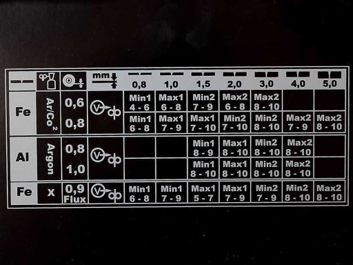 Tabela , w której można znaleźć zalecane ustawienia spawania o różnych grubościach