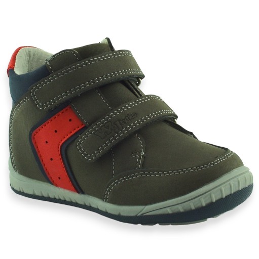 Chłopięce buty za kostkę w kolorze szarym z dodatkiem granatu i czerwieni. Doskonałe na wiosenne lub jesienne spacery, zabawy na placu zabaw. Komfort stopom zapewni skórzana wkładka i zapicie na rzepy.