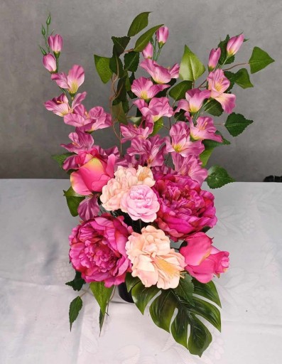 Wiązanka nagrobna wykonana ręcznie z wysokiej jakości sztucznych kwiatów w donicy zalanej betonem.