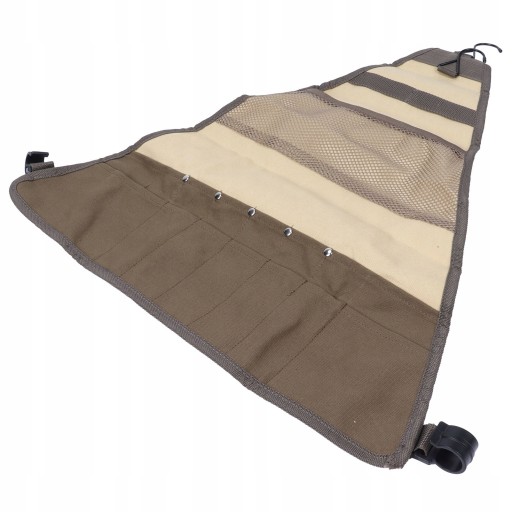 - Rozłóż złożoną torbę do przechowywania i połóż ją płasko, a następnie użyj haczyka, aby zawiesić ją na stojaku kempingowym lub na pasie z drzewa o odpowiedniej wysokości.