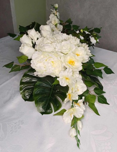 Wiązanka nagrobna wykonana ręcznie z wysokiej jakości sztucznych kwiatów w donicy zalanej betonem.