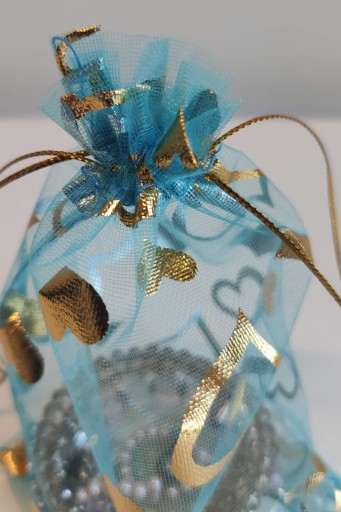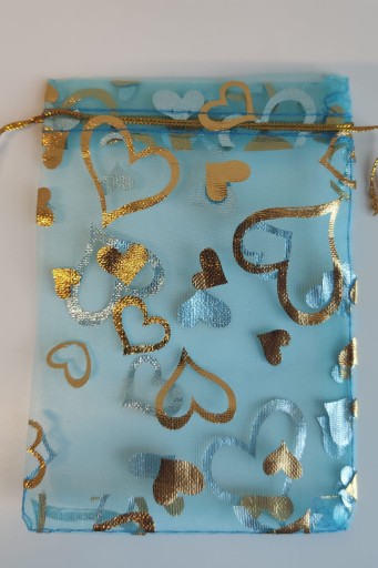 Ściągane woreczki z organzy w kolorze jasnoniebieskim ze złotymi serduszkami.