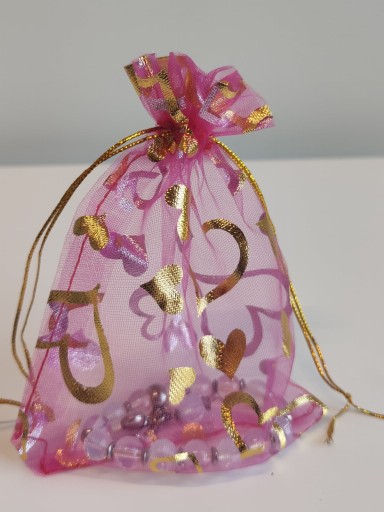 Ściągane woreczki z organzy w kolorze różowym ze złotymi serduszkami