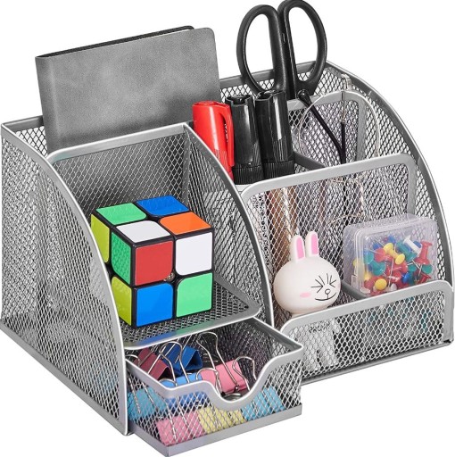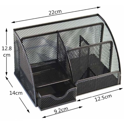✅ POJEMNY - posiada jedną dużą przegródkę oraz 4 mniejsze przegródki, a także półkę i szufladkę, w których każdy zmieści wszystkie potrzebne akcesoria biurowe.