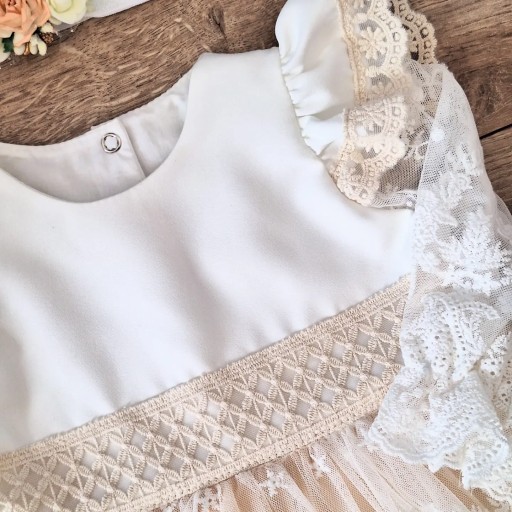 Prezentowana w aukcji sukienka to połączenie dwóch kolorów:delikatnej śmietanki i ciepłego beżu. Koronka która została wykorzystana w tej sukience to bawełniany haft na tiulowej siateczce.