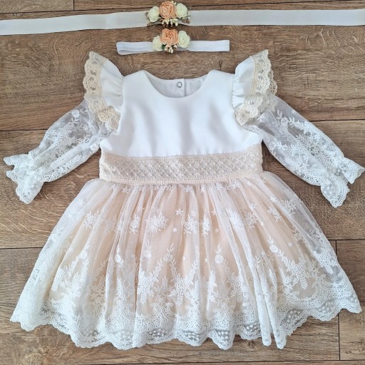 Sukienka na chrzest ma koronkowy rękawek - nie obawiaj się, że Córeczce będzie chłodno. Pod sukienkę możesz założyć body z długim rękawem w chłodniejsze dni.