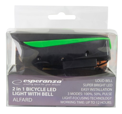 Lampka rowerowa przednia Esperanza ALFARD to urządzenie 2 w 1. Posiada mocną białą diodę LED, emitującą silne światło o strumieniu 100 lumenów. Dzięki niej, po zmroku droga przed Tobą będzie bardzo dobrze oświetlona, a Ty będziesz widoczny dla innych użytkowników ruchu. Urządzenie dysponuje 3 trybami świecenia. Lampka posiada również bardzo głośny dzwonek, który może też służyć jako alarm w przypadku niebezpieczeństwa.