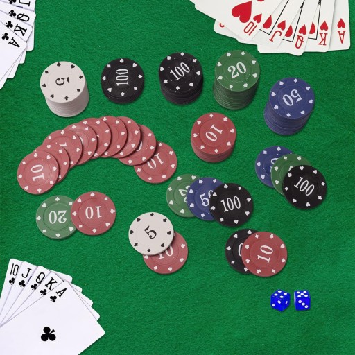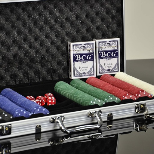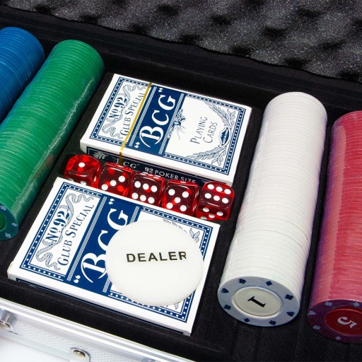 Profesjonalny, solidnie wykonany zestaw do gry w pokera lub kości. Z dwoma taliami kart, kompletem kości i 500 żetonami do gry, zapakowany w elegancki kuferek. Zawiera wszystkie elementy potrzebne do gry w pokera, kości lub blackjacka: dwie talie kart, komplet kości, żeton krupiera - DEALER.