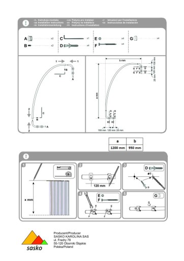Drążek łukowy do zasłony prysznicowej do wanny asymetrycznej narożnej 95cm x 120cm uniwersalny lewy/prawy