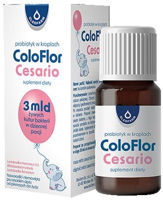Coloflor cesario - krople to suplement diety przeznaczony dla noworodków i niemowląt, które urodziły się przez cesarskie cięcie. Wskazany do stosowania celem uzupełnienia ich diety w żywe kultury bakterii: Lactobacillus rhamnosus GG (ATCC 53103), Bifidobacterium infantis (BIO 5478), Lactobacillus fermentum (CECT 5716).
